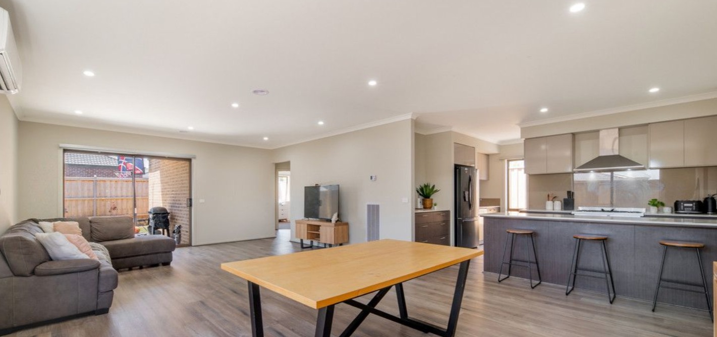 As you enter the property, you are welcomed into a front lounge area, which is carpeted and provides a cosy and inviting atmosphere. The open-plan living and dining area that extends effortlessly from the well-equipped kitchen to the sensational sheltered alfresco.