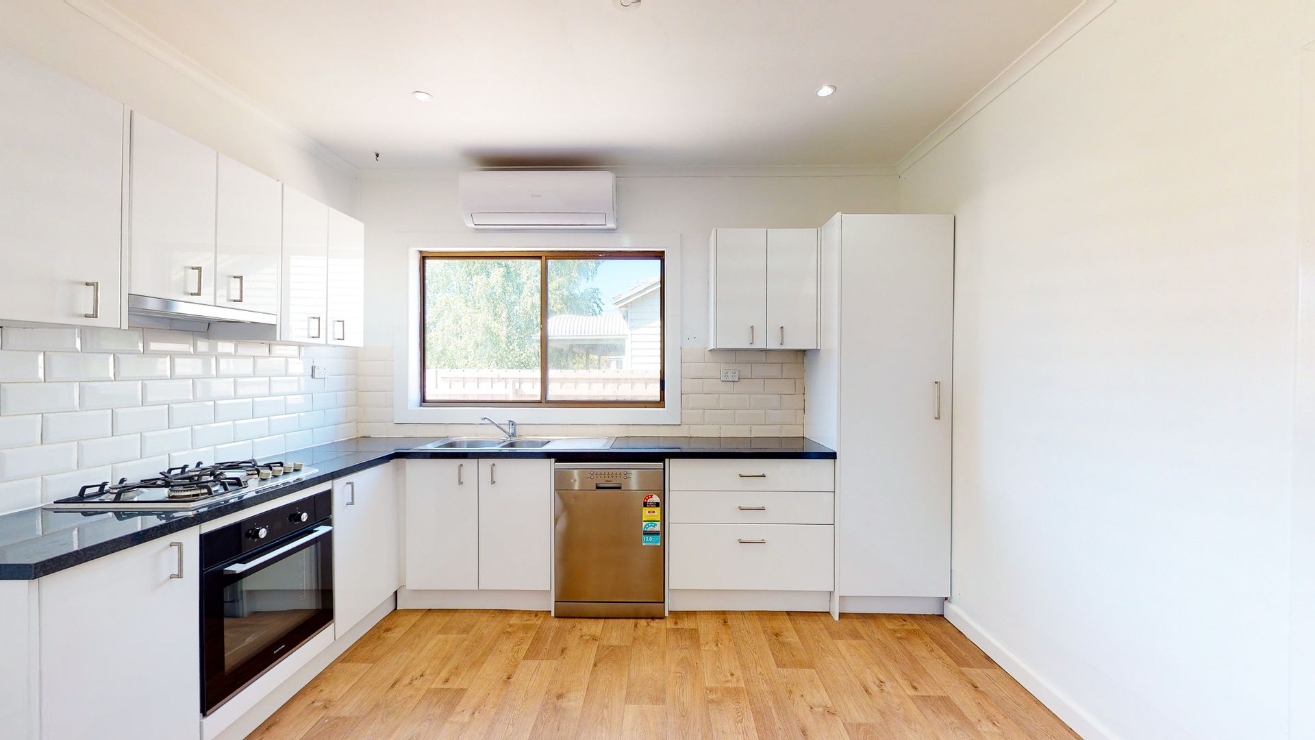 Open plan kitchen, living, and dining area flooded with natural light.