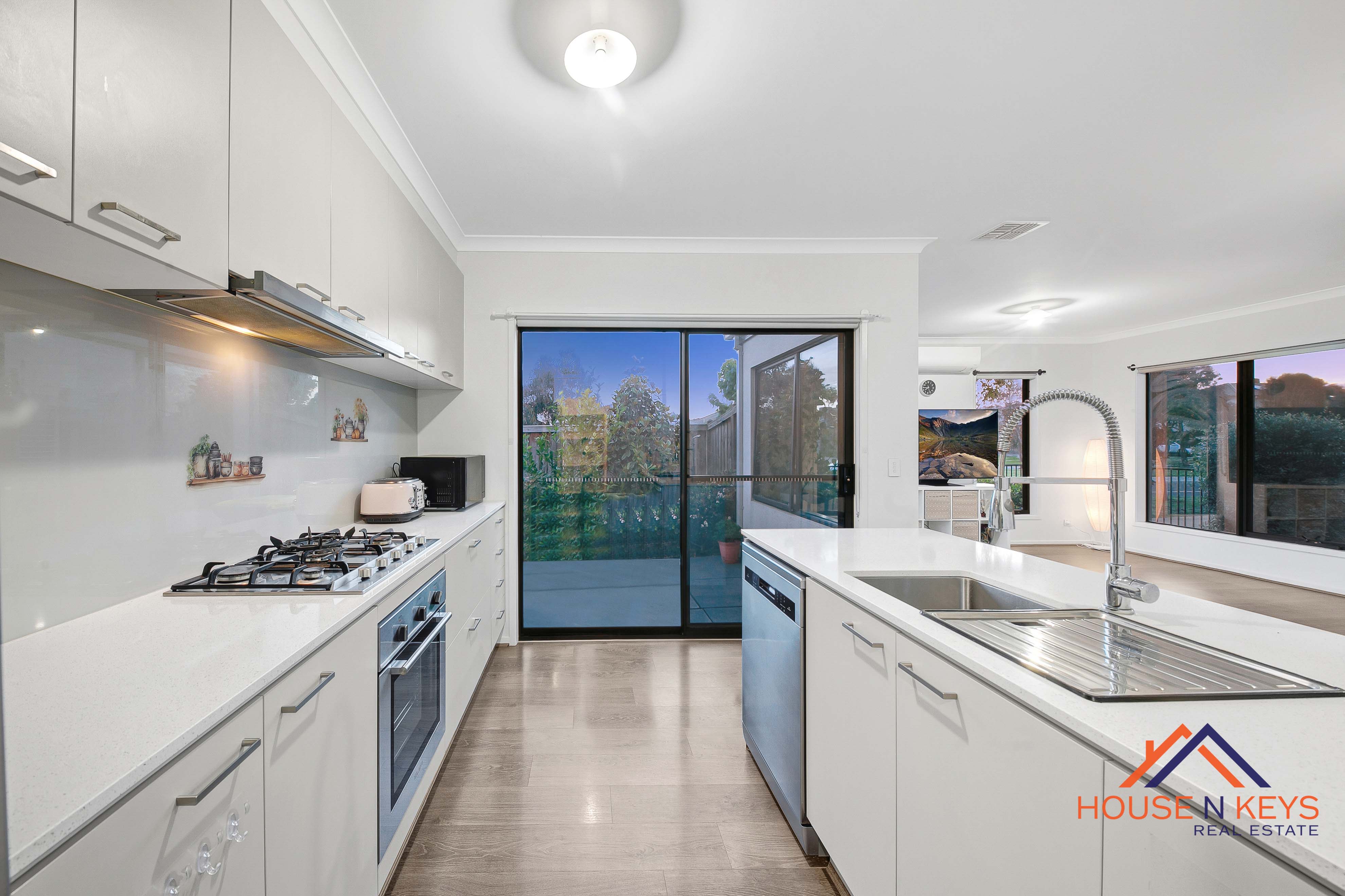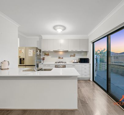 Inside, the home offers an inviting open-plan layout on the lower level, seamlessly connecting the kitchen, dining, and living zones — perfect for entertaining and everyday family life. The modern kitchen is fitted with stone benchtops, stainless steel appliances, and a walk-in pantry. A powder room downstairs adds convenience for guests.
