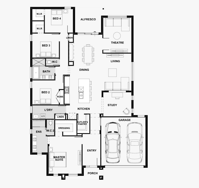 Multiple living zones including a main living area, theatre room, and study (or second living)