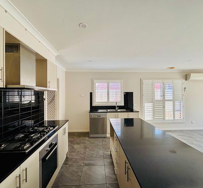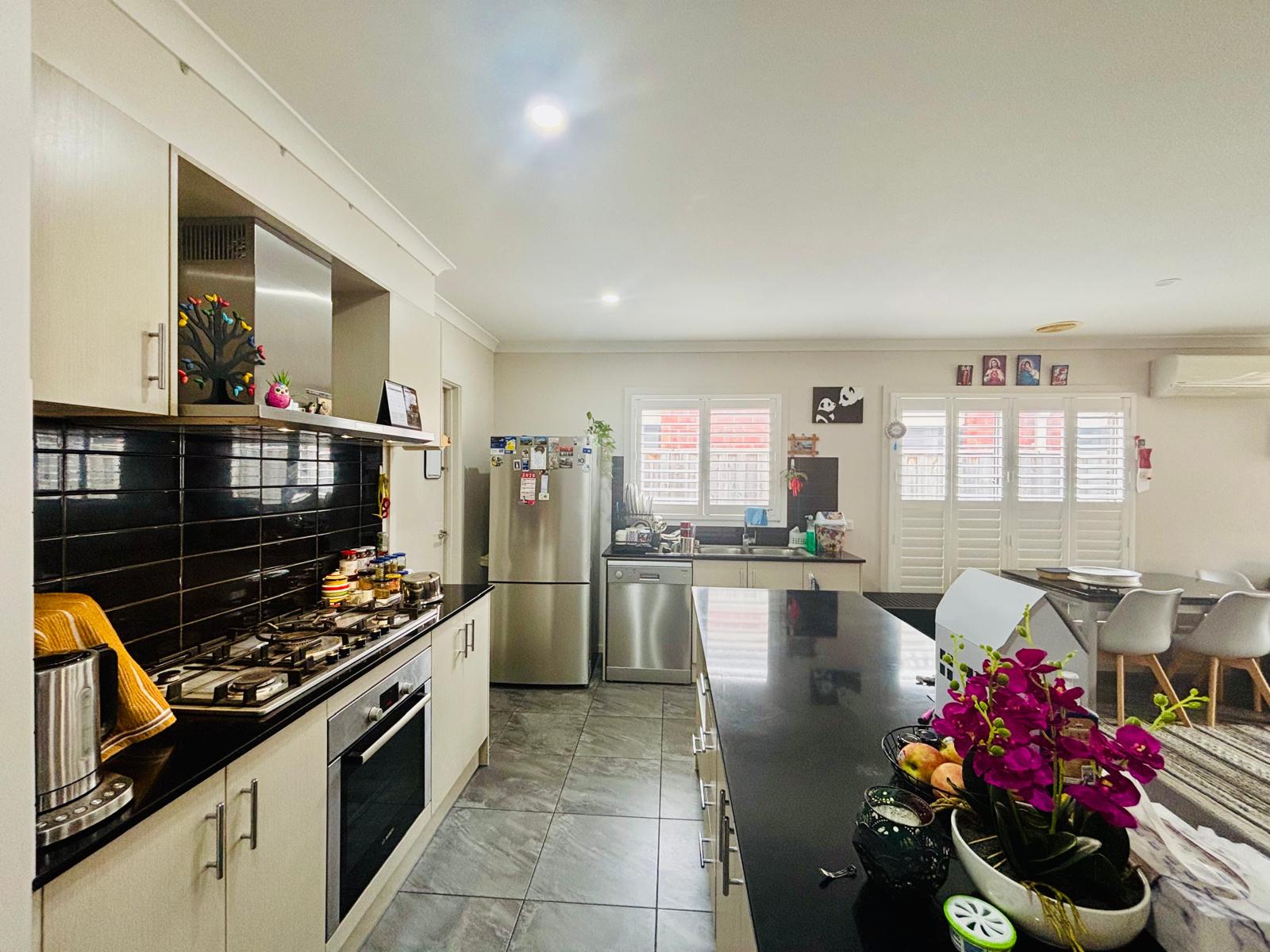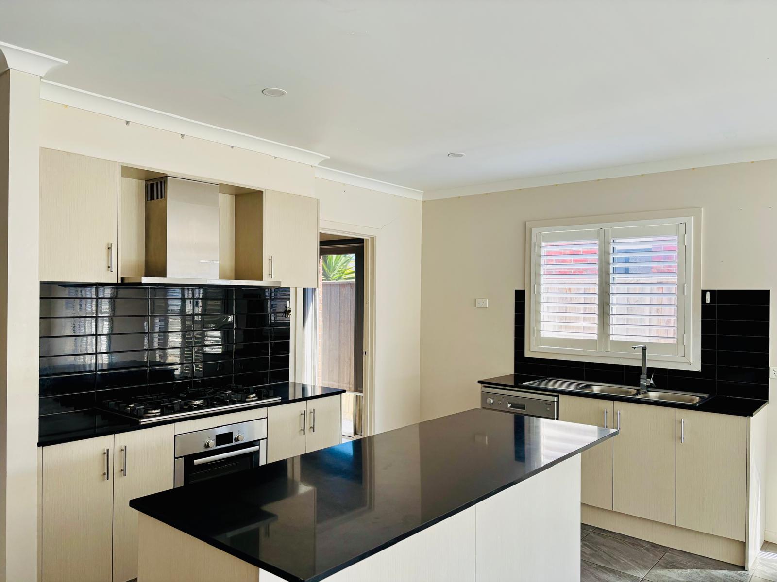 At the heart of the home is a modern kitchen equipped with stainless-steel appliances, stone benchtops, ample bench and cupboard space and walk-in pantry. The open-plan meals and living areas flow seamlessly into the low-maintenance backyard, complete with concreting and artificial lawn.