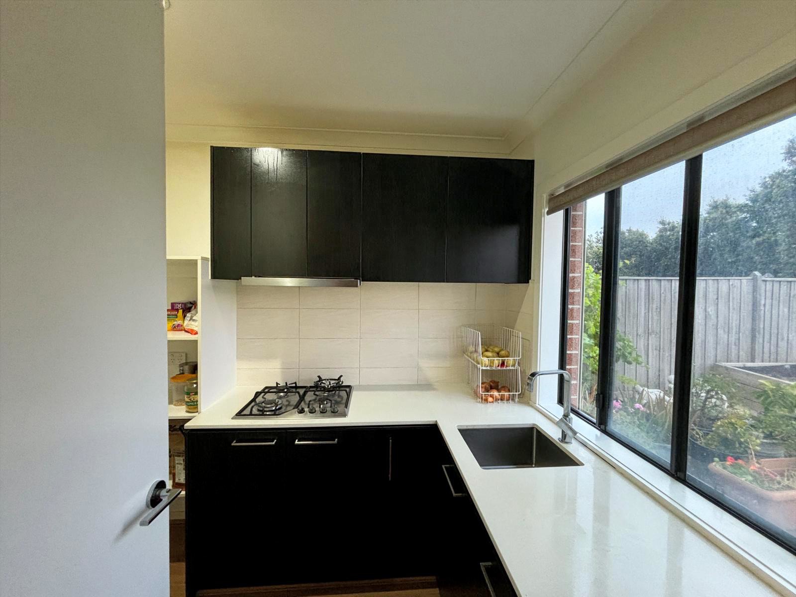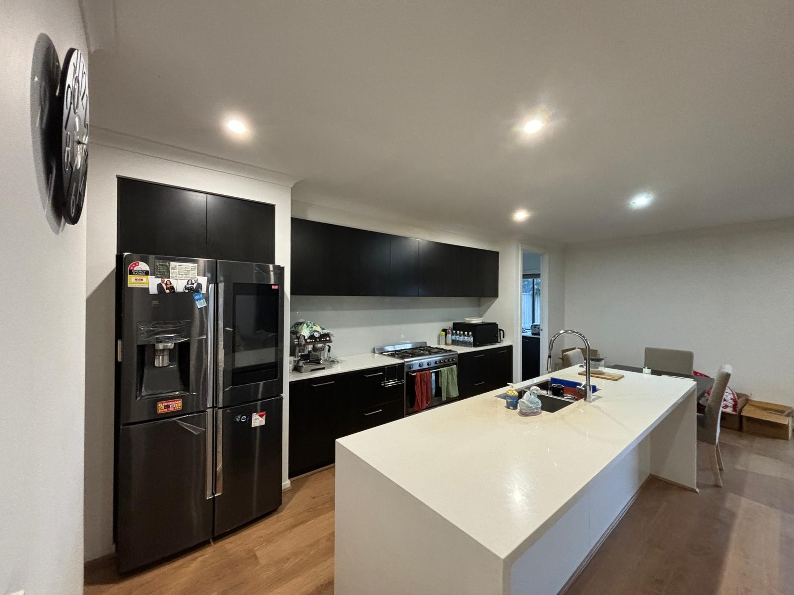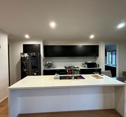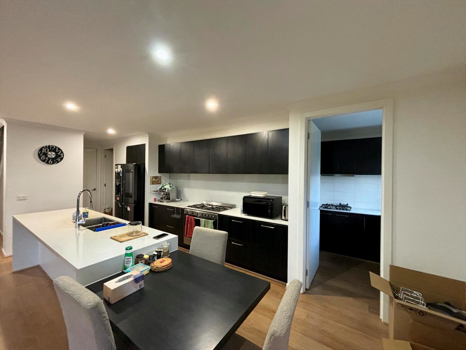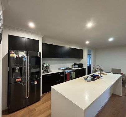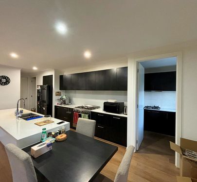 At the heart of the property is a spacious open-plan kitchen, dining, and living zone, flooded with natural light. The stunning kitchen features stone benchtops, a large island, stainless steel appliances, and a butler’s kitchen, seamlessly connecting to the living areas—ideal for both everyday living and entertaining.
